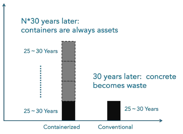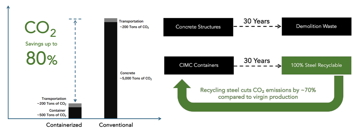 Unlike concrete structures that become demolition waste at end of life, container modules can be repurposed, relocated, or recycled as steel.