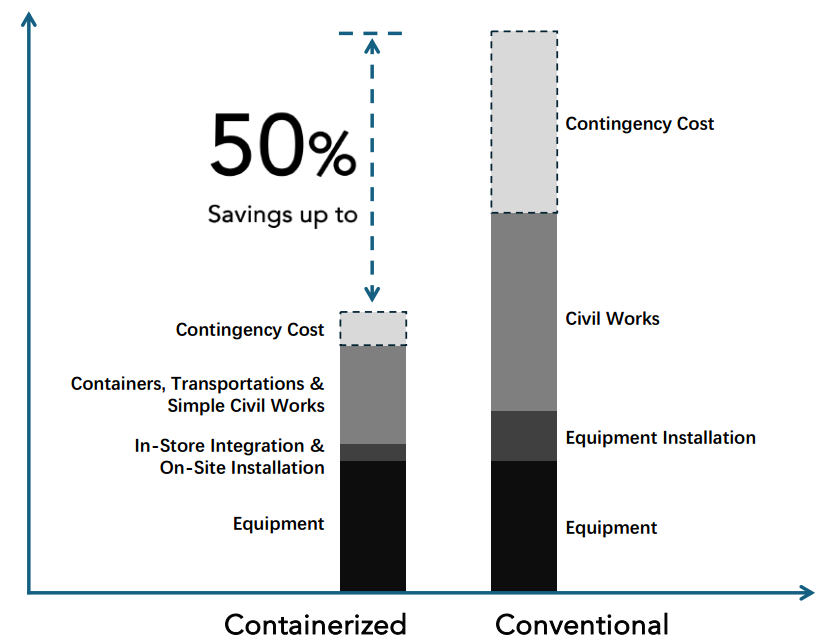 Containerized systems significantly reduce uncertainties, civil work costs, and contingency budgets.